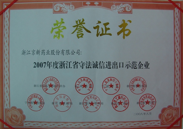 为树立遵法诚信收支口企业典范,,,,,,推进收支口企业诚信系统建设,,,,,,浙江省打私与海防口岸办、杭州海关、宁波海关、浙江磨练检疫局、宁波磨练检疫局、省国税局、省外汇管理局、省工商局、省外经贸厅团结在全省规模内开展了2007年度遵法诚信收支口树模企业推荐运动。。。。。。。。经各市打私办与有关职能部分派合推荐,,,,,,省级有关部分派合审核,,,,,,宣布了2007年度浙江省遵法诚信收支口树模企业,,,,,,我公司榜上著名。。。。。。。。